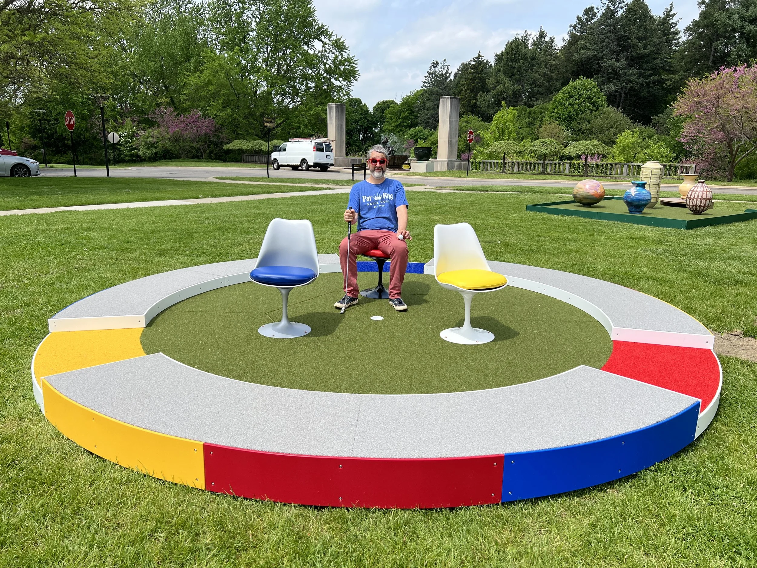 "Slum of Legs" is inspired by the iconic Tulip chair designed by Eero Saarinen for the Knoll company in 1955. Eero Saarinen was just 15 years old when his father Eliel began designing Cranbrook. The Tulip chair, manufactured by Knoll, is named for its resemblance to the early spring bloom. Saarinen designed each piece in the Tulip series with a single pedestal leg, creating a unified environment of chairs, tables, and stools. Describing his intentions to simplify the structure, he said: "The undercarriage of chairs and tables in a typical interior makes an ugly, confusing, unrestful world. I wanted to clear up the slum of legs. I wanted to make the chair all one thing again."